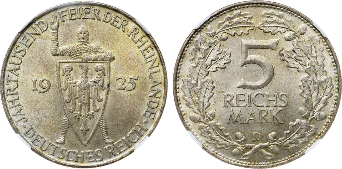Серебро. Мюльденхуттен (Е). Отчеканена в память 1000-летия Рейнской области (Рейнланда). KM 47. Jaeger 322. Weege 25.. MS 64.