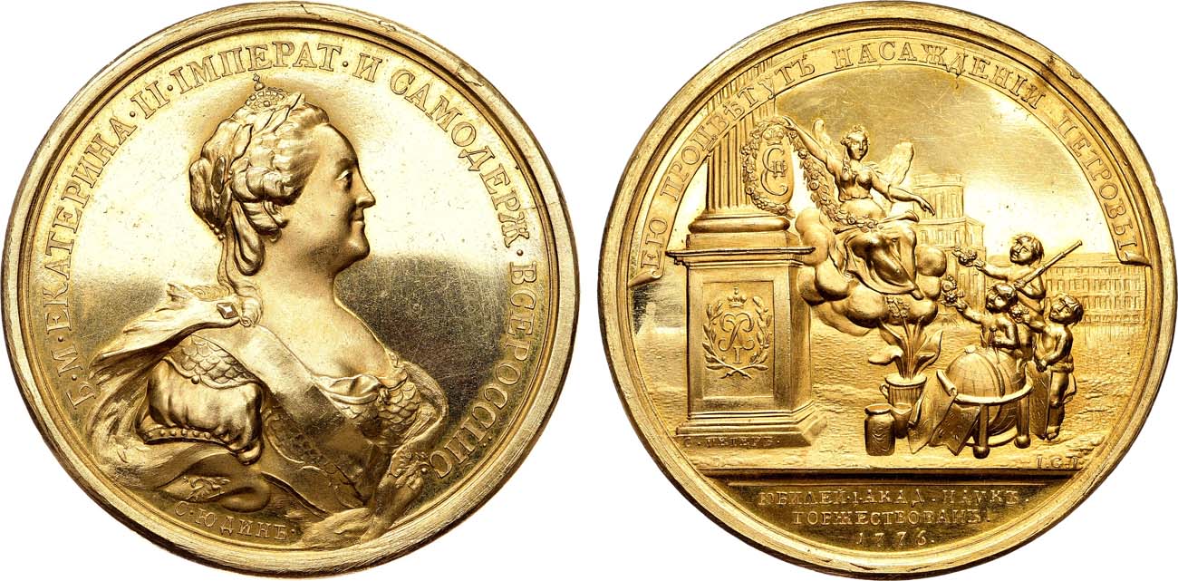 Количество медалей, отчеканенных в золоте, в XVIII веке, как правило, не превышало нескольких экземпляров. С аукциона Kuenker #271, Оснабрюк, февраль 2016 года, лот 771.