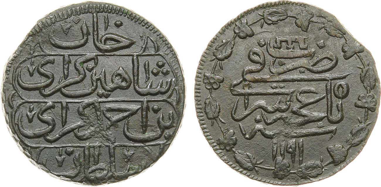 Медь. 10,49г. Бахчисарайский монетный двор. Аверс: венок из 8 листьев с усиками и 8 цветков, против часовой стрелки. Сариев 437. AU.