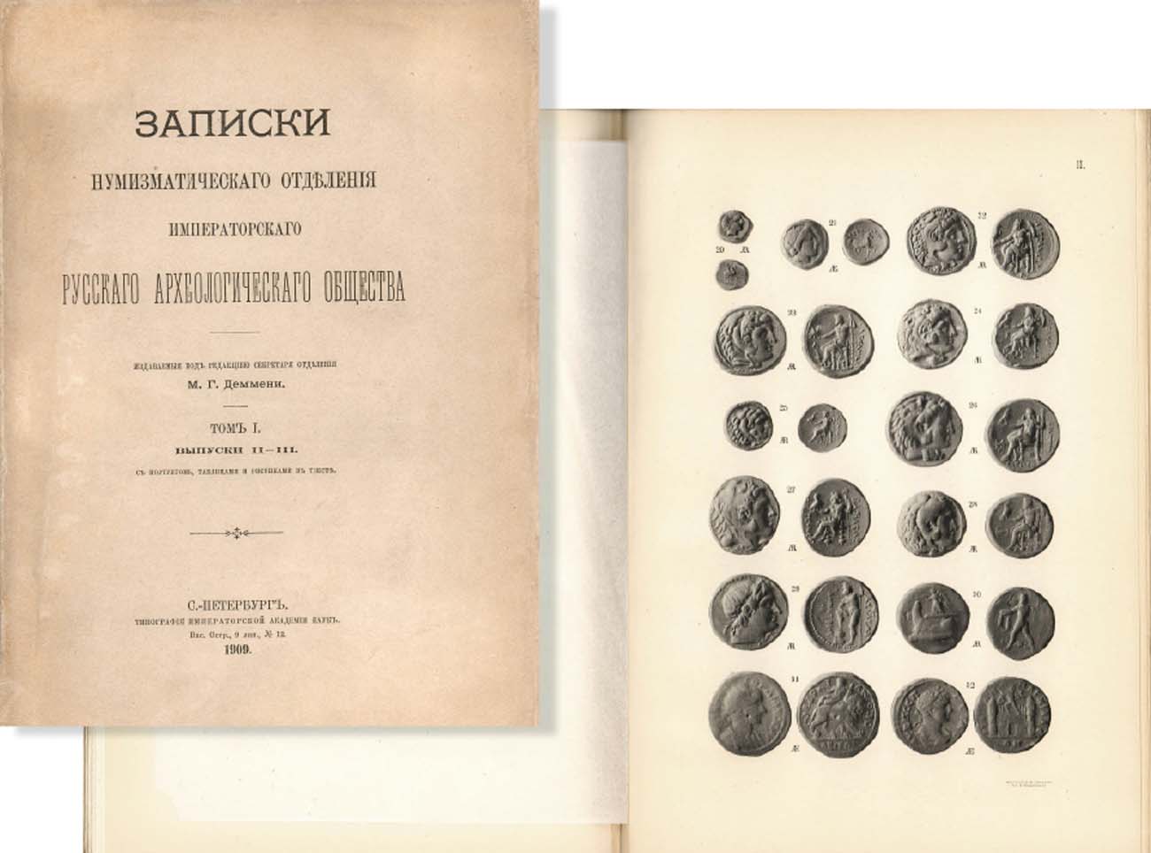 СПБ, 1909 г. 176 стр. + Х табл. илл. В выпуск включены интереснейшие статьи А.А. Ильина о ранее неизвестных монетах периода Екатерины I и Петра II, статьи А.К. Маркова о чистке монет и о кладе куфических монет, статьи по древне-греческим и римским монетам. А также две статьи М.Г. Деммени "К вопросу о чеканке севских чехов" и некролог Х.Х.Гиля.
