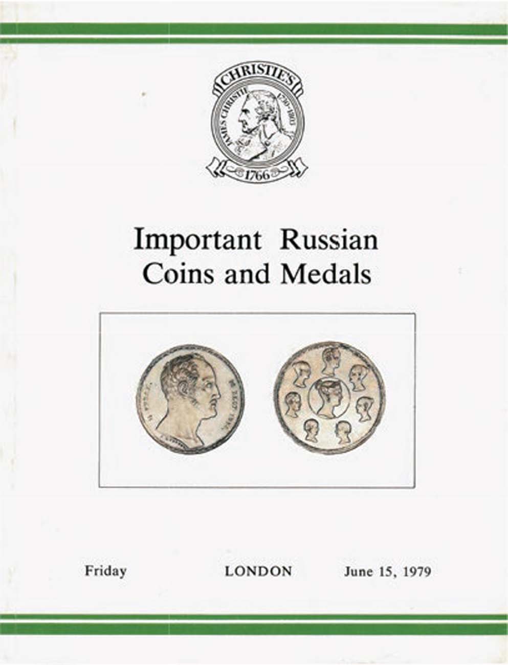 Лондон, 15 июня 1979 года. Лондон. 250 лотов. Представлены редкие русские монеты XIX-XX вв. из знаменитой коллекции Пантелеймона Синадино, петербургского собирателя, приобретавшего монеты на всех знаменитых торгах начала XX века (из распродаж дублетов русских музеев, из коллекции Вел.Кн.Георгия Михайловича, Толстого, Гуттен-Чапского) и у известных коллекционеров, таких как барон Нолькен и граф Бобринский.