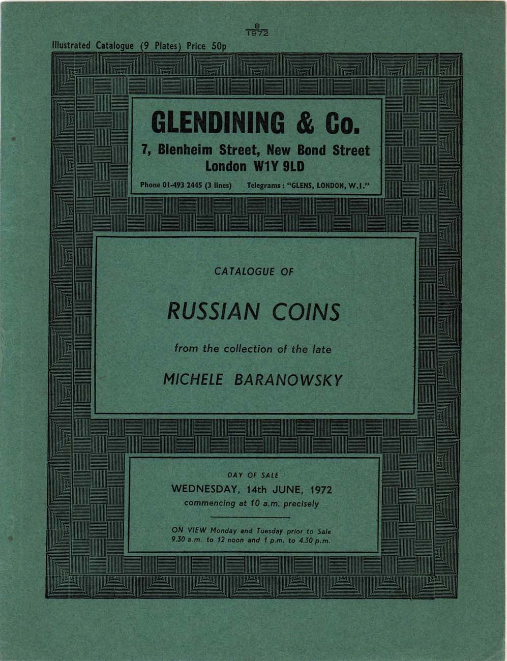 Лондон, 14 июня 1972 года. 228 лотов, 19 стр., 9 табл. илл. Знаменитая коллекция Мишеля Барановского. Много интересных и редких русских монет. Стоит выделить 5 рублей 1832 года "из россыпей колыванских", ефимки, новодел рубля 1736 года работы Гедлингера, новоделы 96 копеек 1757 года и 48 копеек 1756 года, а также подборку очень редких новодельных монет XVIII века.