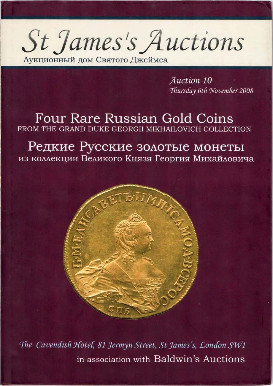 Лондон, 6 ноября 2008 года. Специальный выпуск каталога с дополнительными иллюстрациями и описаниями четырем монетам из коллекции Великого Князя Георгия Михайловича, представленных на аукционе: 2 рубля 1726, 10 рублей 1762, 10 рублей 1836 года в память 10-летия коронации и исключительно редкие пробные 20 рублей 1755 года с клеймом Гуттен-Чапского.