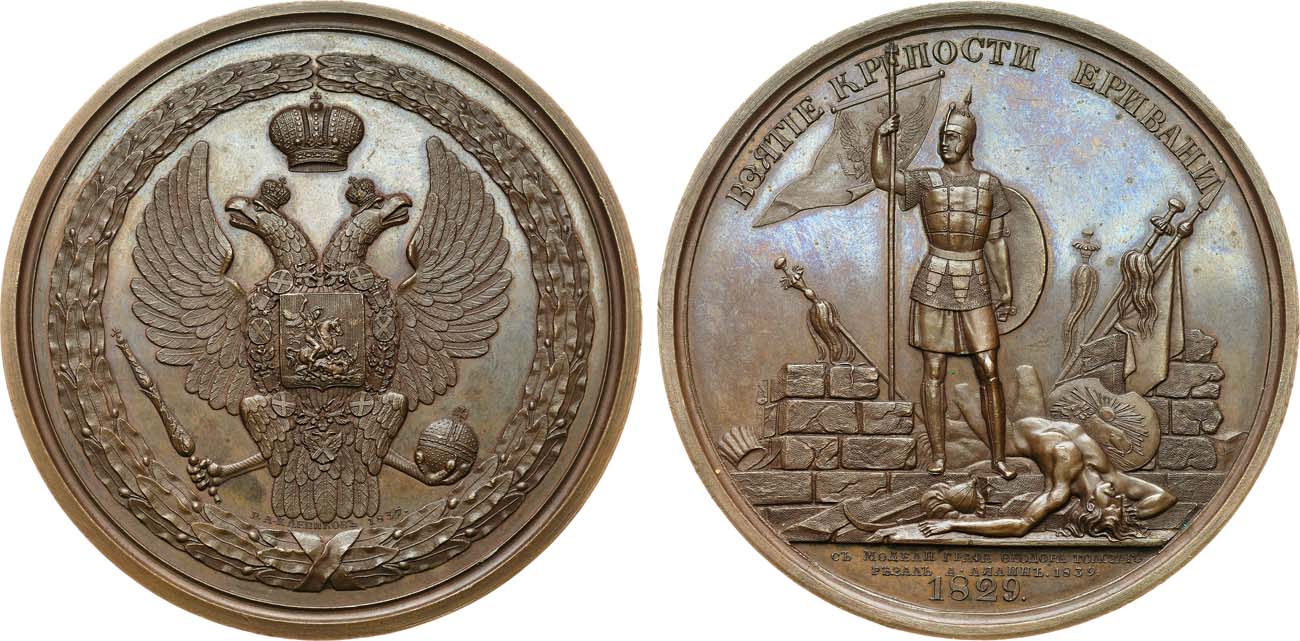 Бронза. 126,73г. Диаметр 65 мм. Санкт-Петербургский монетный двор. Медальеры А.А. Клепиков (на аверсе под орлом "Р•А•КЛЕПИКОВЪ 1837."), А.П. Лялин по модели графа Ф.П. Толстого (под обрезом изображения "СЪ МОДЕЛИ ГРАФА ѲЕОДОРА ТОЛСТАГО / РѢЗАЛЪ А• ЛЯЛИНЪ. 1839."). Дьяков 1788(R1). UNC.