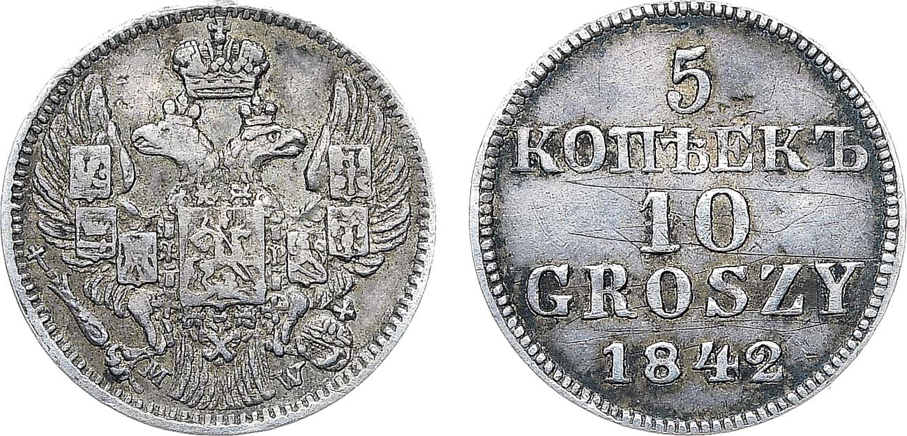 В каталоге В.В. Узденикова 5 копеек-10 грошей 1842 года относятся к категории пробных монет. С аукциона Монеты и Медали #71, Москва, октябрь 2011 года, лот 219.
