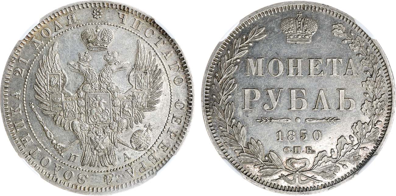 Данная разновидность рубля 1850 года редко встречается на открытых аукционных торгах.
