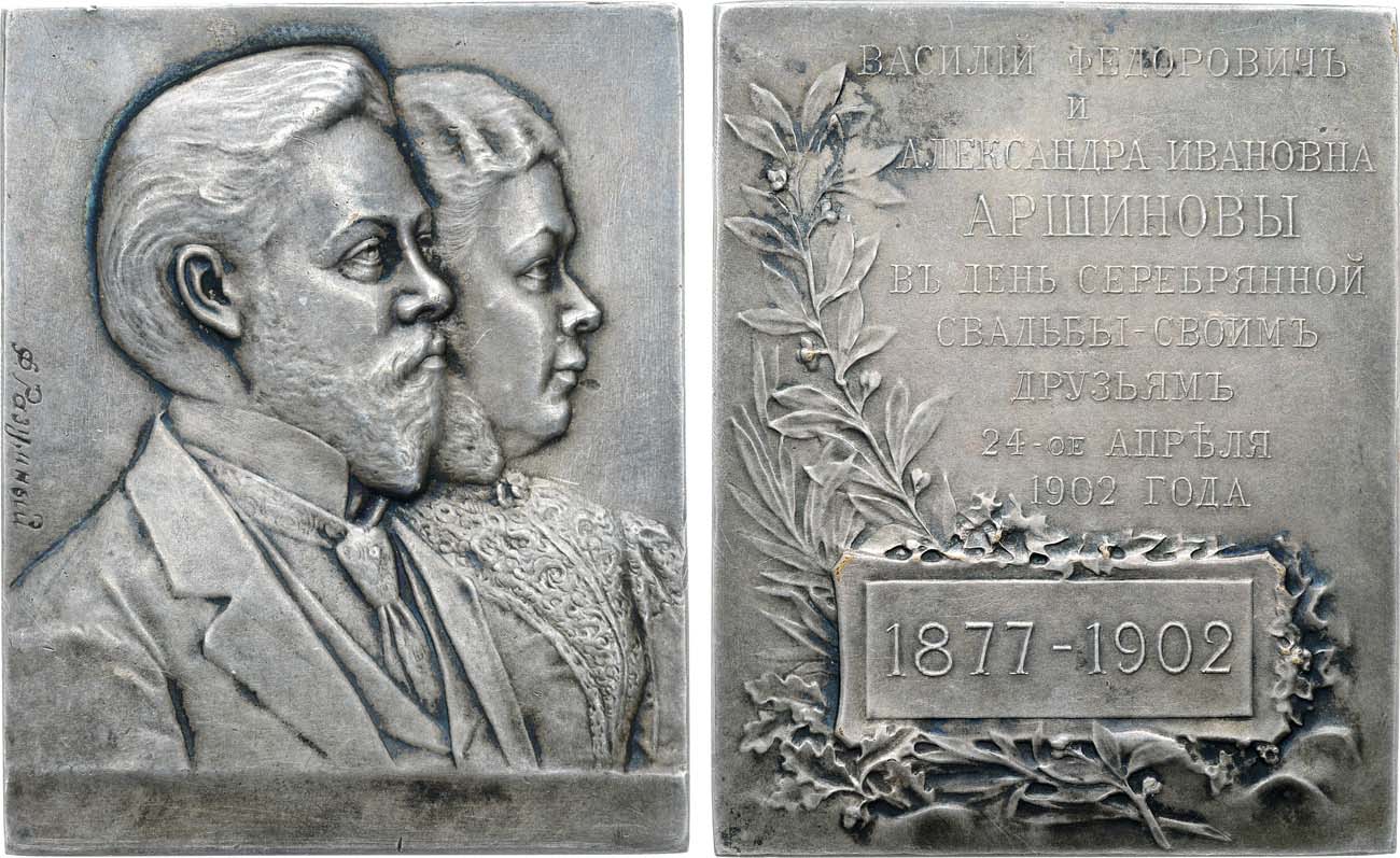 Бронза, серебрение. 71,87г. Размеры 48х60 мм. Франция, Париж. Медальер Ф. Разумный (на аверсе слева на поле "Ф. Разумный"). Клеймо на гурте плакеты сверху: "BRONZE" - название металла. Дьяков 1346.1(R3). UNC.
