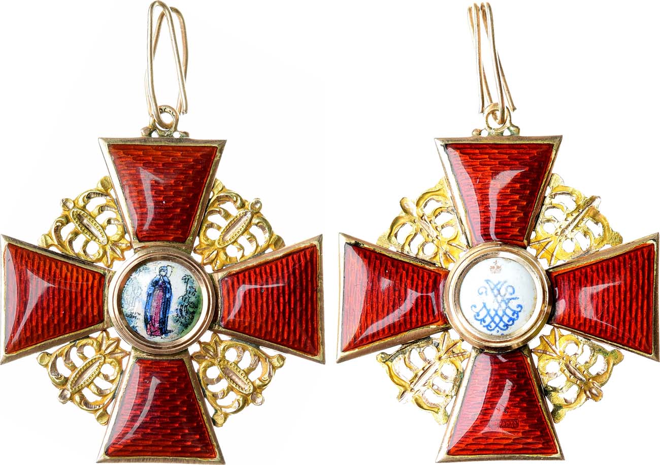 Золото, эмаль. 9,1г. Размеры: 38х35 мм. Клейма: 1. Санкт-Петербургского окружного пробирного управления 1904-1908 гг ("56", "женская голова в кокошнике влево", "АР" - инициалы управляющего округом А.В. Романова) в овальном щитке – на аверсе ушка. 2. "ИЛ" (И.Г. Линстед) - клеймо ювелира фирмы "ЭДУАРДЪ" - на реверсе верхнего луча. 3. Фирменное "ЭДУАРДЪ" - на реверсе нижнего луча. 4. Знак удостоверения Санкт-Петербургского окружного пробирного управления 1904-1908 гг ("женская голова в кокошнике вправо с инициалами управляющего округом "АР" снизу) - на гурте центрального кольца. Российская Империя, Санкт-Петербург, 1904-1908 гг, фирма "ЭДУАРДЪ". UNC.