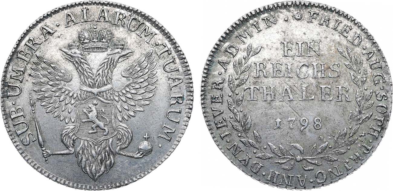 Серебро. 22,13г. Монетный двор в Зильберхютте. Монета отчеканена в княжестве Йевер по специальному разрешению Павла I, имевшего титул князя Йеверского. Уздеников 4923(–). Биткин 1(R1). AU 55.