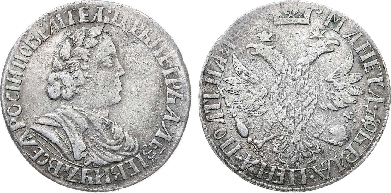 Серебро. 13,95г. Кадашевский монетный двор. Аверс: "ПОВЕЛIТЕЛЬ•ЦРЬ"; "широкий" портрет образца 1702 года. Реверс: "ПОЛТIНА"; "широкий" орёл; корона закрытая. Уздеников 0457(∸). Биткин 523(R2). 65 рублей по Петрову. Дьяков 25, 62(R3). XF 45.