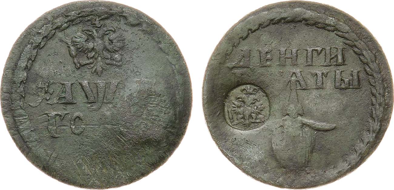 Медь. 4,17г. Кадашевский монетный двор. C надчеканом. Аверс: малая корона. Реверс: борода узкая. Гурт гладкий. Биткин Ж3893(R2). Руденко Б.5 (R3). Brekke 46, 3(–). XF.