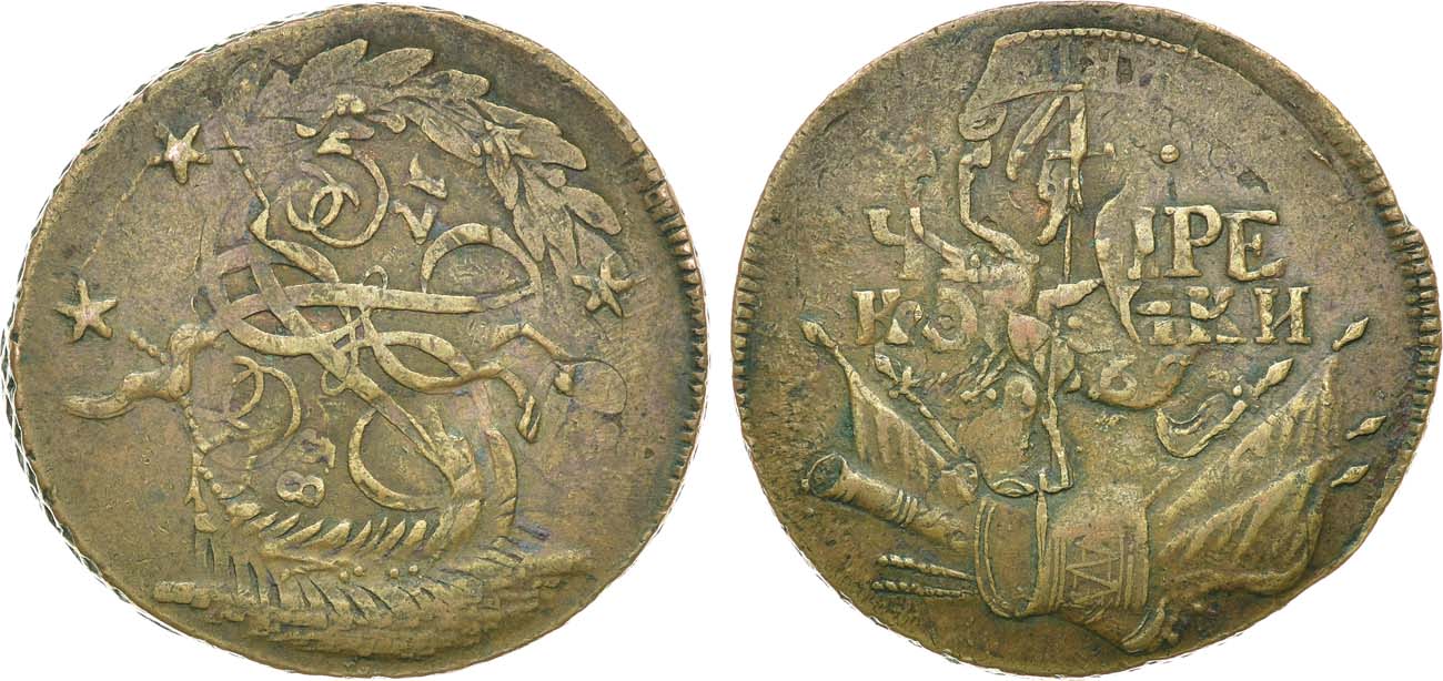 Медь. 20,34г. Реверс: "•4•" номинал выделен точками, цифры даты выделены точками "•17 62•". Перечекан из 2 копеек 1758 года. Гурт сетчатый. Уздеников 2625(•). Биткин 27. Дьяков 181, 33. Brekke 105, 12. AU 50.