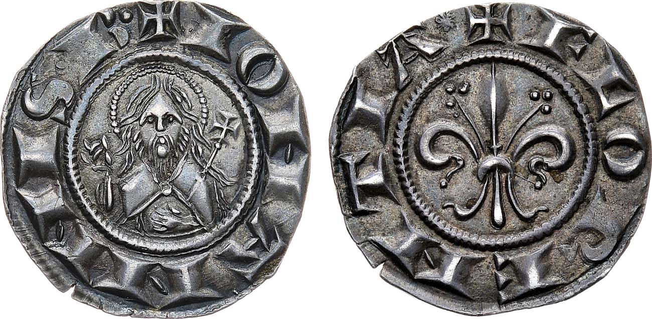 Серебро. 1,52г. Флоренция. Аверс: Иоанн Креститель с крестом и поднятой рукой; круговая легенда "+ IOHANNES". Реверс: изображение флорентийской лилии; круговая легенда "+ FLORENTIA". AU/UNC.