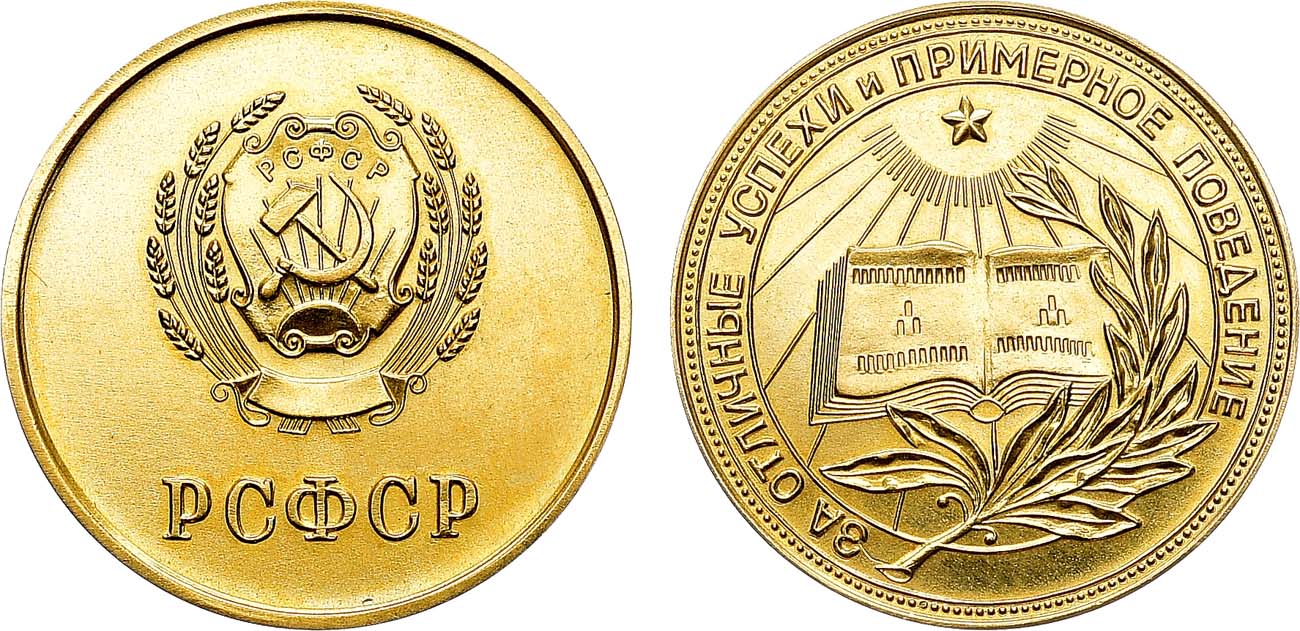 Золото. 15,47г. Диаметр 32 мм. Ленинградский монетный двор. Медаль образца 1954 года. Реверс: буквы круговой надписи высокие, корешок книги сомкнут, имеет овальную форму, верхний луч звезды в слове "ПРИМЕРНОЕ" указывает в начало буквы "И", ручка серпа толстая. (Шт. 2.1). Богданов, с.20. UNC.