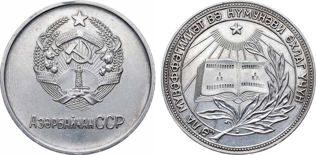 Серебро. 16,15г. Диаметр 32 мм. Ленинградский монетный двор. Медаль образца 1954 года. Аверс: нефтяная вышка толстая. Реверс: буквы круговой надписи высокие, корешок книги сомкнут. Богданов, с.120. UNC.