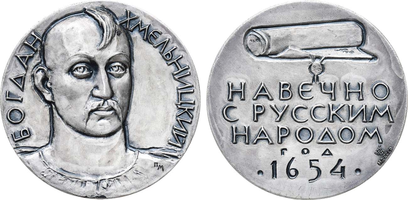 Серебро. 31,56г. Диаметр: 40 мм. Московский монетный двор. Медальер - П.В. Мельникова ("ПМ" - на рельефе левого плеча Б. Хмельницкого). Тираж 252 экземпляра. Проба 925. Шкурко, Салыков 538. MS 62.
