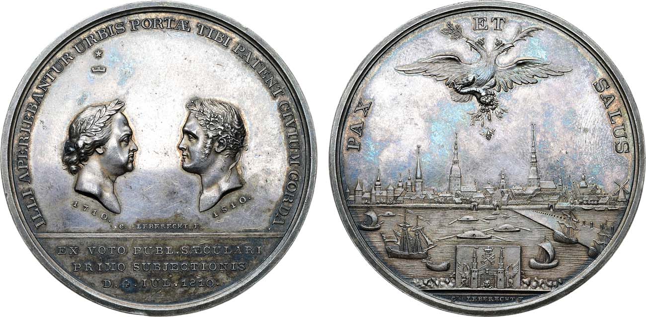 Серебро. 62,71г. Диаметр 55 мм. Санкт-Петербургский монетный двор. Медальер К.А. фон Леберехт (аверс – над линией между портретами: "C.de LEBERECHT F."; реверс – под гербом Риги: "C de LEBERECHT F"). Легенда на аверсе медали: «ILLI APERIEBANTUR URBIS PORTAE TIBI PATENT CIVIUM CORDA.» (Ему открывались градские врата, Тебе открыты сердца граждан), под обрезом – «EX VOTO PUBL.SAECULARI PRIMO SUBJECTIONIS. D.4.IUL.1810.» (В память первого столетия после покорения. 4 июля 1810 г.) Легенда на реверсе медали: «PAX ET SALUS» (Мир и благоденствие). Дьяков 336.1(R2). UNC.
