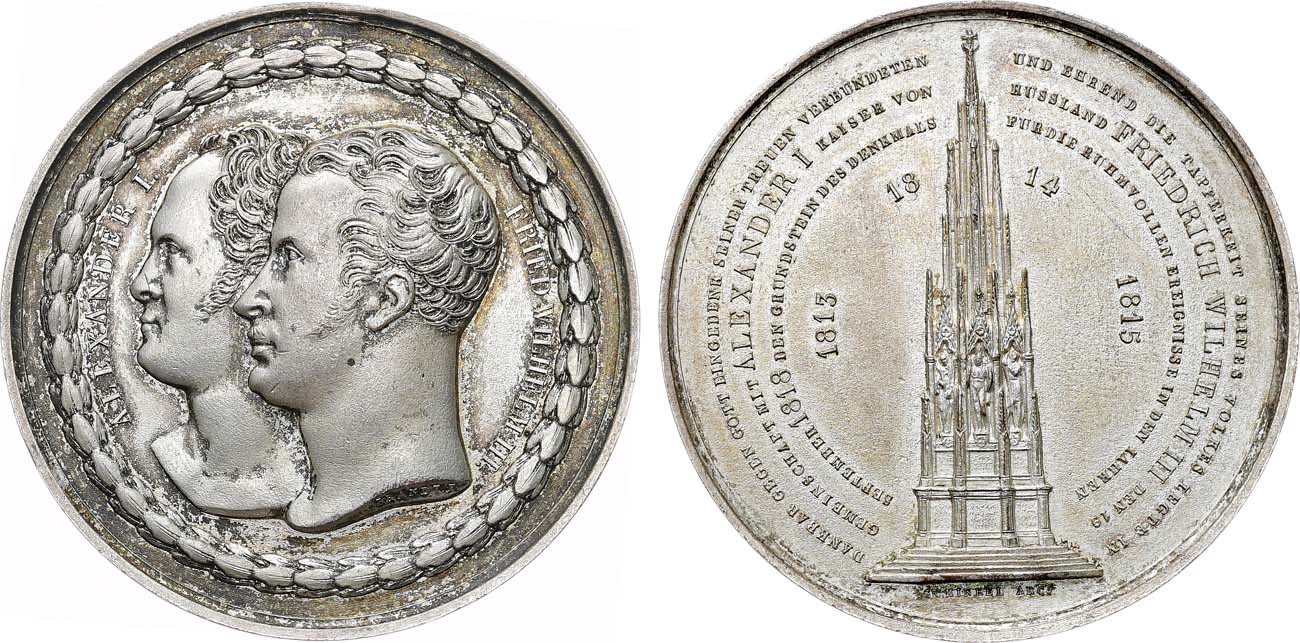 Бронза, серебрение. 66,18г. Диаметр 50 мм. Пруссия. Берлинский монетный двор. Медальер Ф. Брандт. Аверс: в обрезе портрета подпись "BRAND.F." (Бранд резал). Памятник был сооружен по проекту архитектора К.Ф. Шинкеля (реверс - под постаментом памятника: "SCHINKEL ARC:"). Reichel 3315(R2). Дьяков 409.1(R2). UNC.