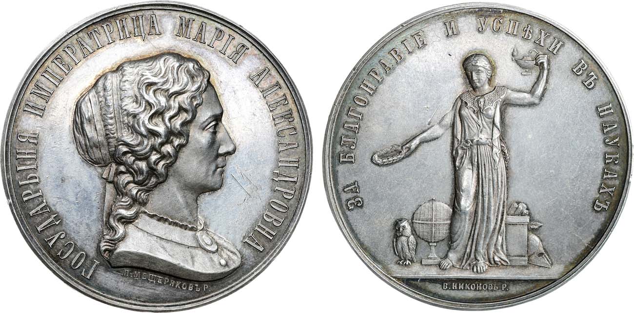 Серебро. 58,33г. Диаметр 50 мм. Санкт-Петербургский монетный двор, начало 1870-х. Аверс: медальер П.А. Мещеряков (под обрезом изображения: "П.МЕЩЕРЯКОВЪ Р."). Реверс: медальер В.В. Никонов (под обрезом изображения: "В.НИКОНОВЪ Р."). Смирнов 718/а (аналог). Дьяков подобен 670.4(R1). Смирнов 718/а. Дьяков 670.4(R1). AU/UNC.