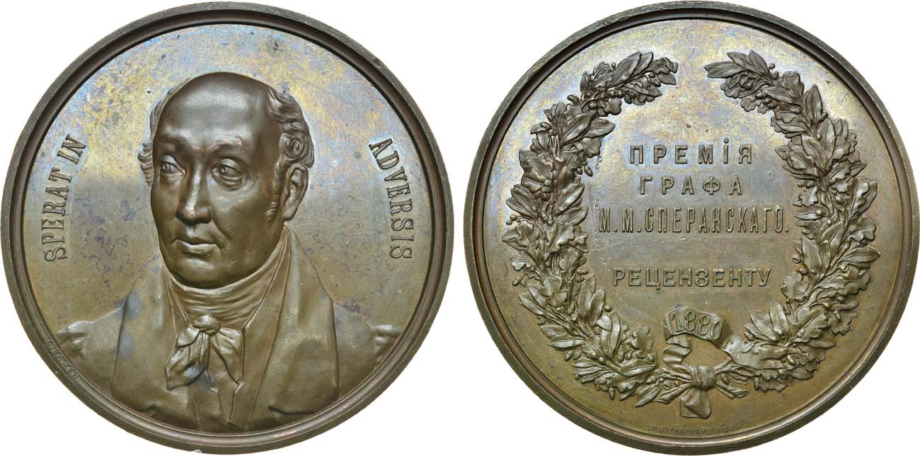 Бронза. 118,4г. Диаметр 65,9 мм. Санкт-Петербургский монетный двор. Медальеры С.З. Важенин и Л.Х. Штейнман (аверс — слева внизу на канте: "С.ВАЖЕН.", реверс — внизу на поле: "Л.ШТЕЙНМАНЪ РѢЗ."). На аверсе размещен девиз графа: «SPERAT IN — ADVERSIS» ("И в несчастье надеются"). Смирнов 792. Дьяков 874.1(N1). MS 63.