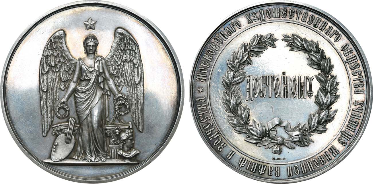 Серебро. 104,31г. Диаметр 60 мм. Санкт-Петербургский монетный двор. Медальер Л. Штейнман (на реверсе под связующей лентой венка "Л.Ш.Р."). На гурте выгравирована надпись: "Шурыгинъ Александръ 1885 г". Смирнов 878/а. Дьяков 941.1(R3). UNC.