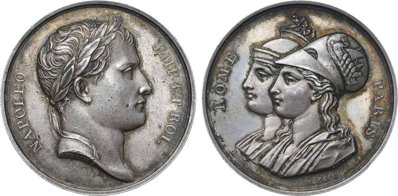 Серебро. 36,72г. Диаметр 40 мм. Франция. Парижский монетный двор. Медальер Андриё (на аверсе в обрезе шеи "ANDRIEU F.", под портретом "DENON DIR.", на реверсе на шесть часов "DENON.DIR MDCCCIX"). Bramsen 849. AU 58.
