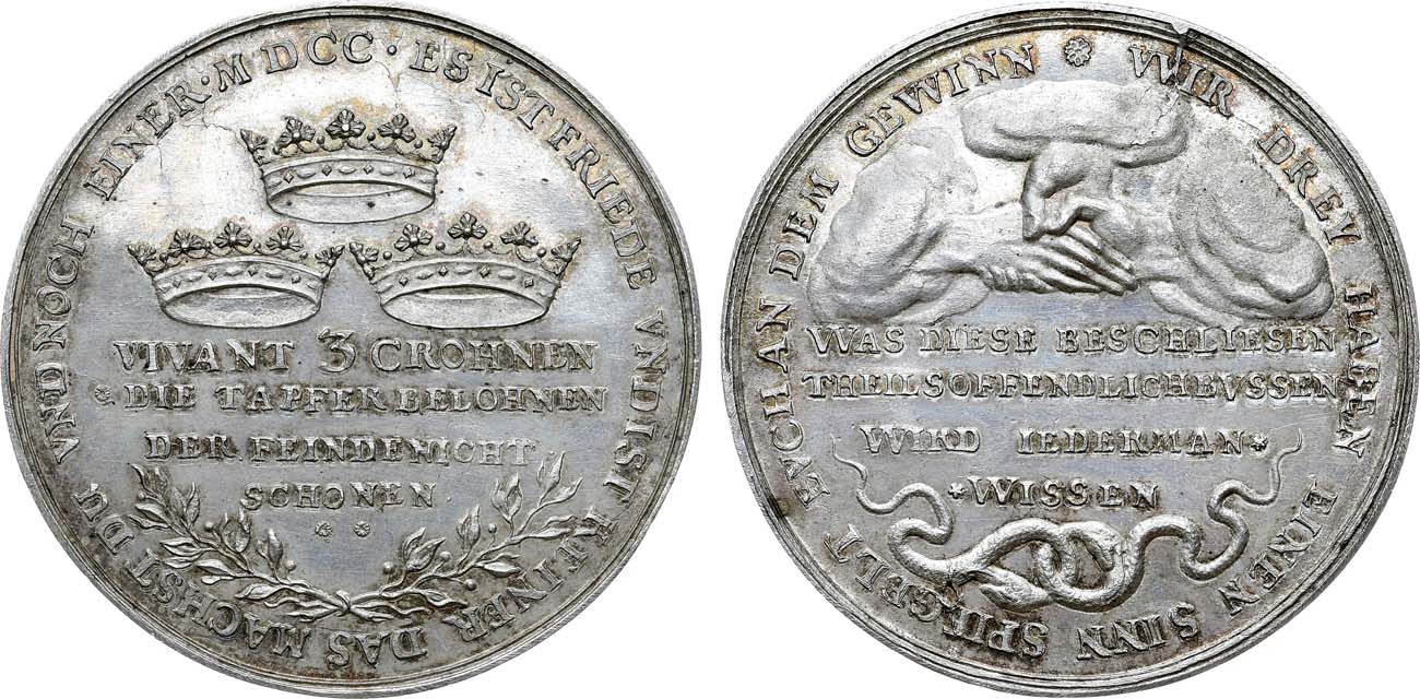 Серебро. 36,48г. Диаметр 50 мм. Медальер J. R. Engelhart (Р. Энгельхарт) без подписи. Аверс: строчная легенда "VIVANT 3 CROHNEN, DIE TAPFER BELOHNEN, DER FEINDE NICHT SCHONEN"; круговая легенда: "ES IST FRIEDE VND IST KEINER, DAS MACHST DU VND NOCH EINER". Реверс: круговая легенда "WIR DREY HABEN EINEN SINN, SPIEGELT EVCH AN DEM GEWINN", строчная легенда в центре "WAS DIESE BESCHLIESEN, THEILS OFFENDLICH BVSSEN, WIRD IEDERMANN WISSEN". Fieweger 973, F. u. S. 4176, Hildebrand I, S. 513, 63. MS 63.