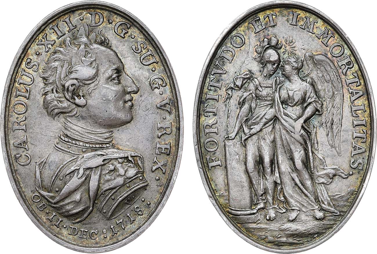 Серебро. 6,94г. Размер 32х23 мм. (Овал). Германия. Нюрнберг. Медальер Г.В. Вестнер (на аверсе в обрезе рукава "V"). Аверс: драпированный портрет короля в доспехах вправо "CAROLVS · XII · D · G · SU · G · V · REX ·", внизу "OB · 11 · DEC : 1718 :". Реверс: персонификации Fortitudo и Immortalitas, стоящие рядом и смотрящие друг на друга; Fortitudo кладет руку на сломанную колонну слева. Hildebrand I 217. IMEANS 1694. AU.