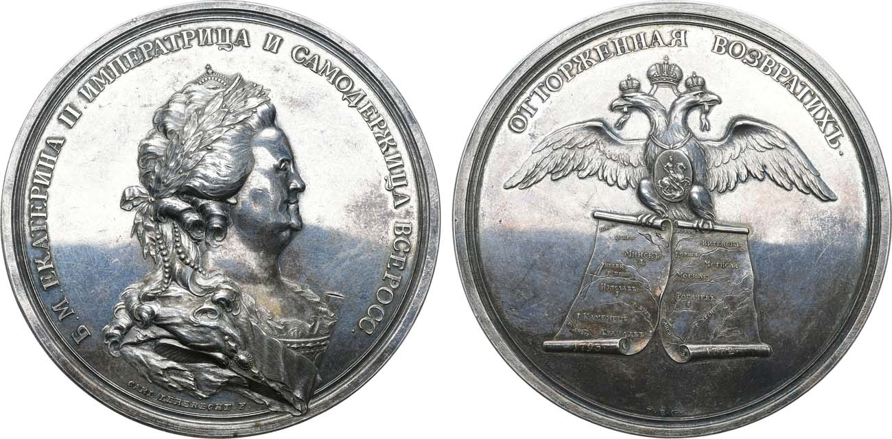 Серебро. 170,91г. Диаметр 79 мм. Санкт-Петербургский монетный двор. Аверс: медальер К. Леберехт (под портретом: "CARL•LEBERECHT•F•"). Реверс: медальер И.Б. Гасс (внизу: "I•B•G•"). Reichel 2872(R1). Дьяков 229.1(R3). AU.