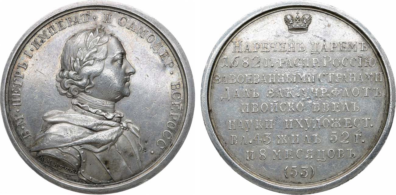 Серебро. 24,75г. Диаметр 39 мм. Санкт-Петербургский монетный двор. Из исторической серии медалей, №53. Медальер копировал К.М. Кучкин (на аверсе в обрезе рукава "К.М. КУЧК."). Смирнов 53. Дьяков 1656(R1). AU.