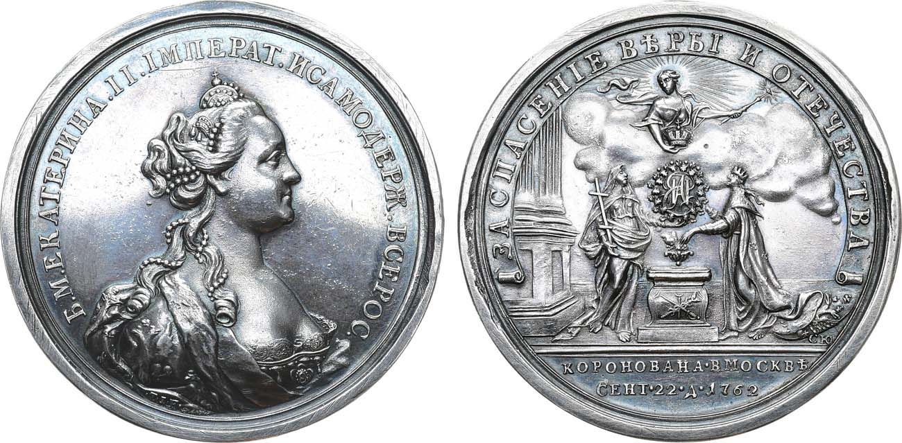Серебро. 50,98г. Диаметр 50 мм. Санкт-Петербургский монетный двор. Аверс: медальер – Т.И. Иванов (под изображением Императрицы по окружности: "•T•I•F"); реверс: медальер – С. Юдин (справа над линией обреза: "СЮ"). Reichel# 2245(R0). Смирнов 246/b. Дьяков 117.5(R2). AU.