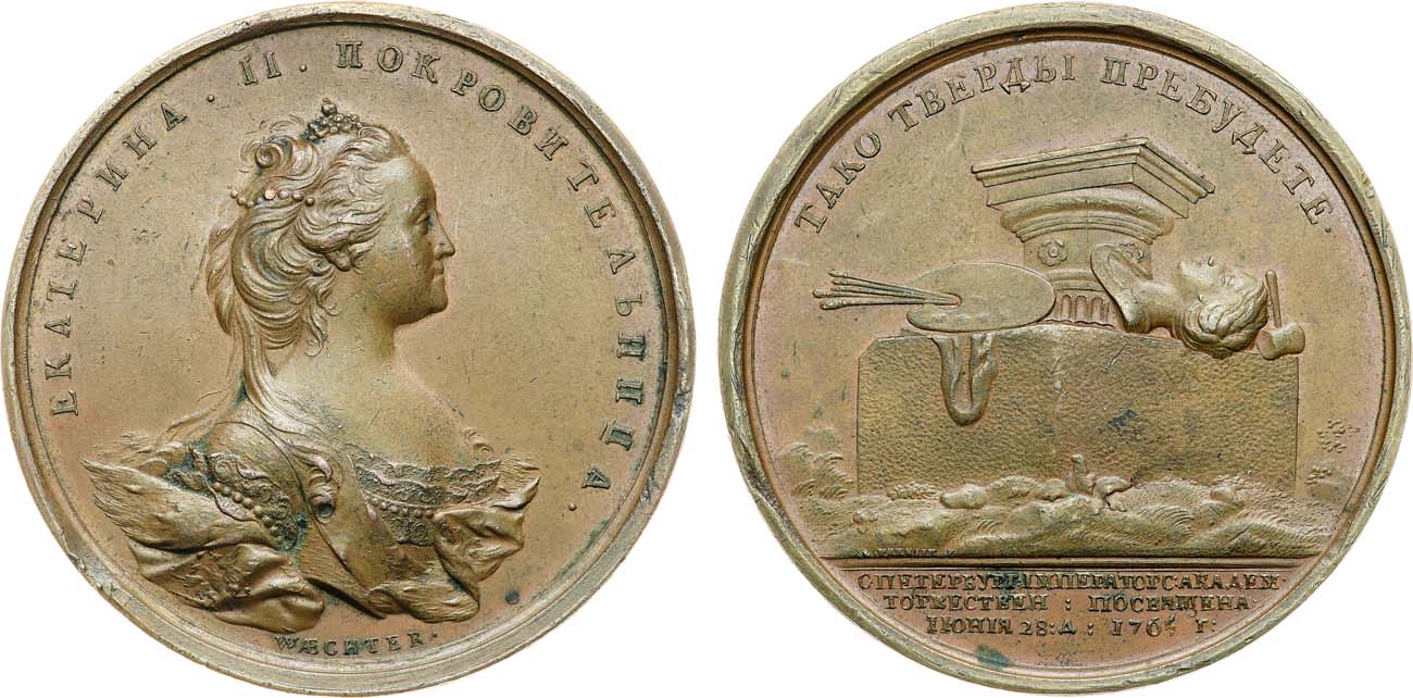 Торжество по случаю открытия здания Академии художеств состоялось 28 июня 1765 года в присутствии императрицы (в годовщину вступления её на престол). Оно включало богато декорированное театрализованное представление на барках на Неве и на пристани, речь конференц-секретаря Салтыкова, вручение дипломов профессорам, приветствие архимандрита Платона, молебен и закладку академической церкви во имя Святой Екатерины, закладку грандиозного здания-ансамбля Академии. Превосходный образец мастерства Иоганна Георга Вехтера. Медальер родился в Гейдельберге в 1726 году, а на русской службе состоял с 1762 года. В его творчестве 1760-хх гг наиболее ярко проявились черты кратковременного и редкого для России стиля рококо. Е.С. Щукина в описании представленной медали отмечала: "...лёгкая небрежность причёски, артистический беспорядок одежды превращают императрицу в хозяйку салона любительницы искусств. "