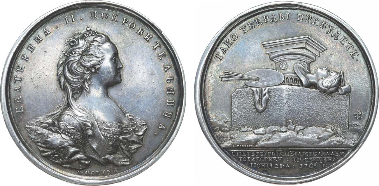 Торжество по случаю открытия здания Академии художеств состоялось 28 июня 1765 года в присутствии императрицы (в годовщину вступления её на престол). Оно включало богато декорированное театрализованное представление на барках на Неве и на пристани, речь конференц-секретаря Салтыкова, вручение дипломов профессорам, приветствие архимандрита Платона, молебен и закладку академической церкви во имя Святой Екатерины, закладку грандиозного здания-ансамбля Академии. Превосходный образец мастерства Иоганна Георга Вехтера. Медальер родился в Гейдельберге в 1726 году, а на русской службе состоял с 1762 года. В его творчестве 1760-хх гг наиболее ярко проявились черты кратковременного и редкого для России стиля рококо. Е.С. Щукина в описании представленной медали отмечала: "...лёгкая небрежность причёски, артистический беспорядок одежды превращают императрицу в хозяйку салона любительницы искусств."