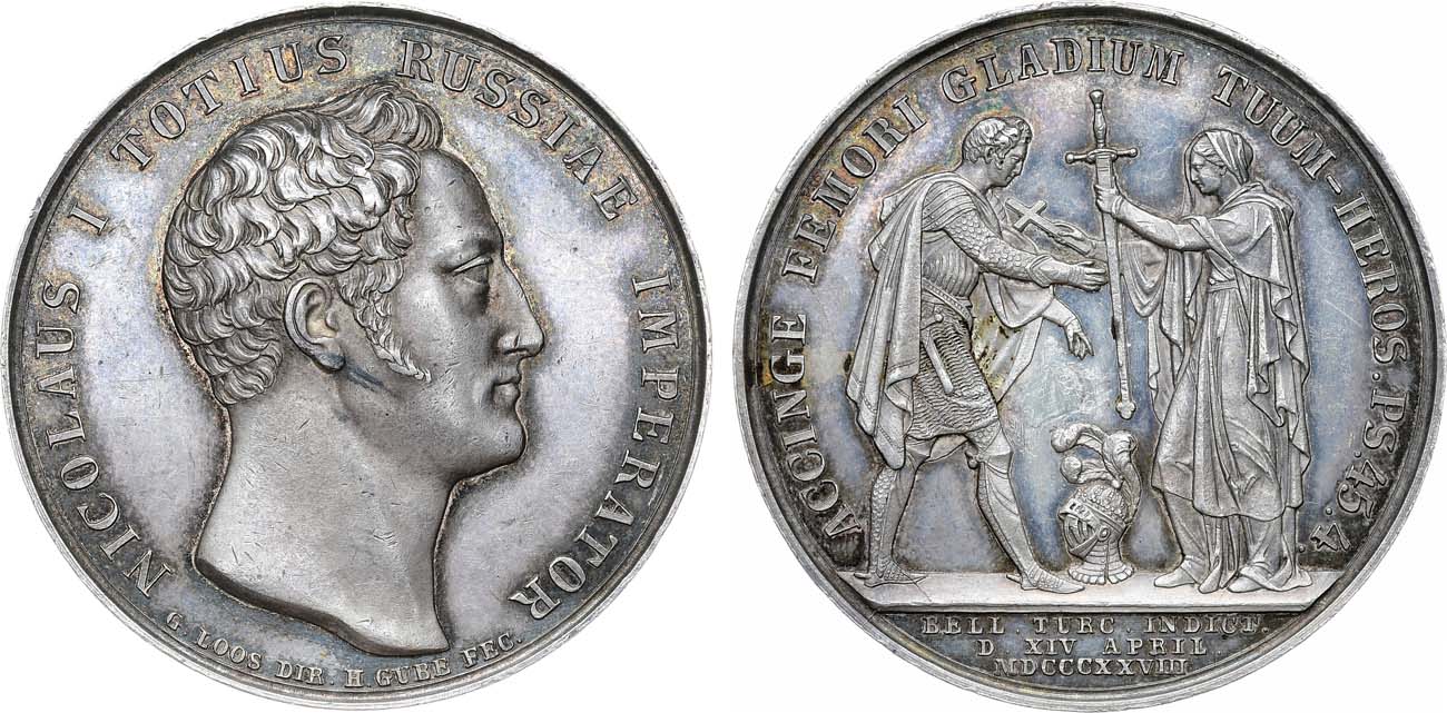 Серебро. 18,19г. Диаметр 38 мм. Пруссия, Берлин. Медальерная мастерская Г. Лооса. Из серии медалей на события Русско-турецкой войны 1828–1829 гг. Медальер Г. Губе (на аверсе под обрезом "G. LOOS DIR. H. GUBE FEC."). Дьяков 470.1(R1). AU.