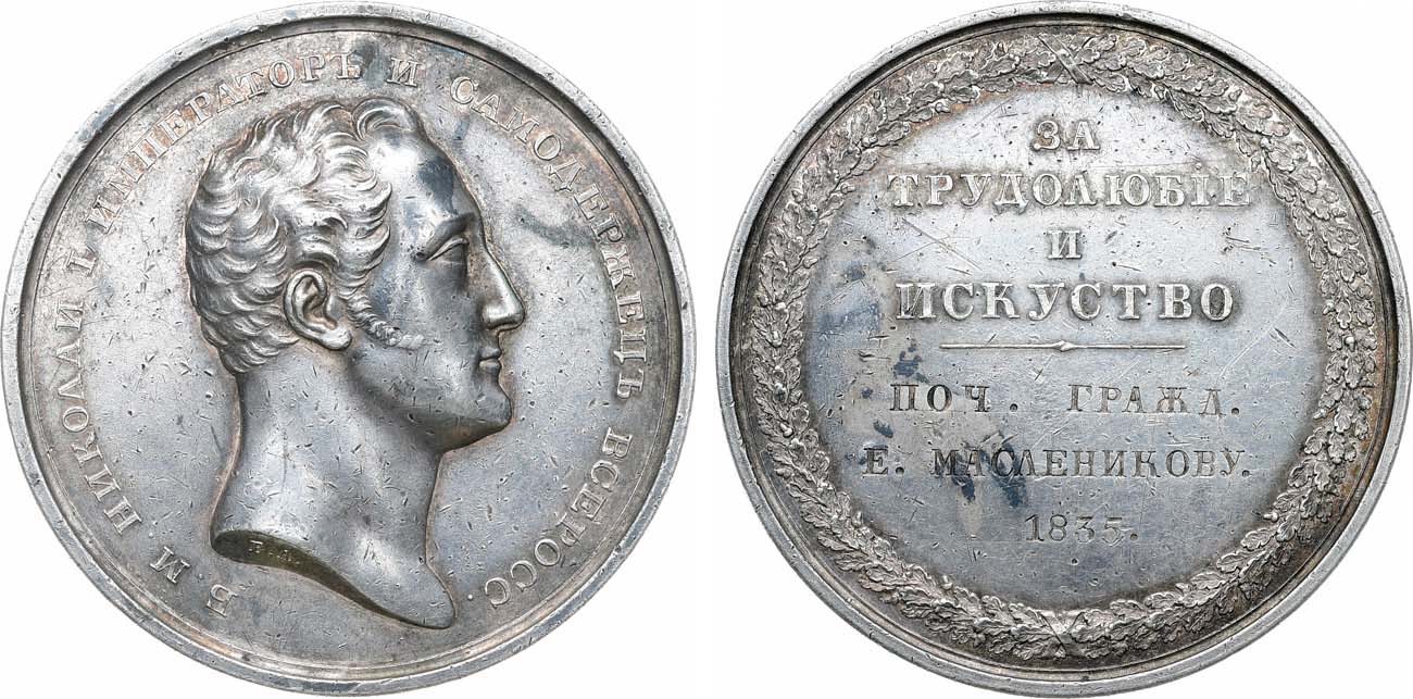 Серебро. 32,07г. Диаметр 41 мм. Санкт-Петербургский монетный двор. Медальер В. Алексеев (на аверсе в обрезе портрета "В.А."). Реверс: гравировка в венке в три строки "ПОЧ. ГРАЖД./Е. МАСЛЕНИКОВУ./1835." Смирнов 451/б. Дьяков 463.2(R2). AU.