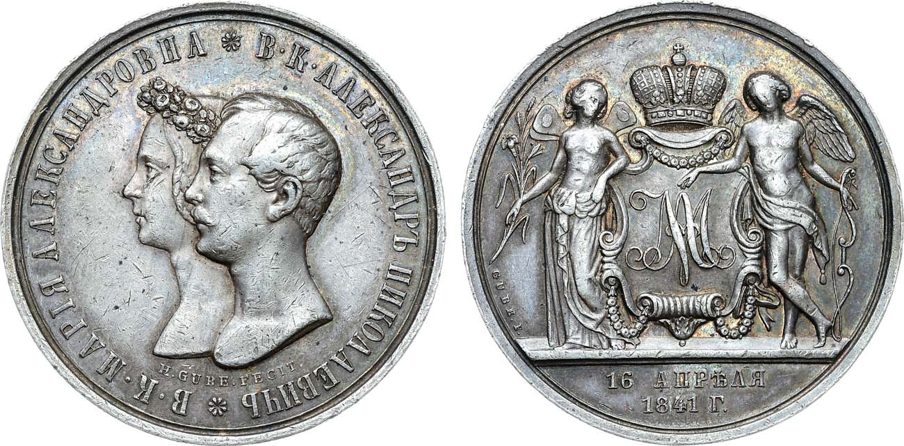 Серебро. 24,37г. Диаметр 36 мм. Санкт-Петербургский монетный двор. Медальер Губе(на аверсе под портретами "H. GUBE. FECIT.", на реверсе слева на 8 часов "GUBE.F."). Гурт гладкий. Биткин М903(R1). Смирнов 513. 6 рублей по Петрову. Дьяков 563.2(R2). AU.