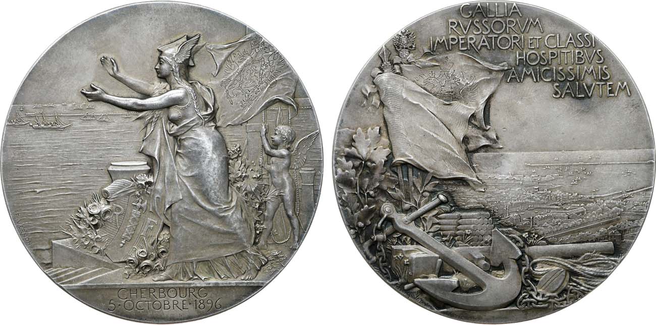 Серебро. 156,61г. Диаметр 70 мм. Франция. Парижский монетный двор. Медальер Ф. Вернон (на аверсе слева по краю окружности "F.VERNON"). На гурте клеймо Парижского монетного двора с 1.1.1880 г. ("рог изобилия") и название металла: «ARGENT» Дьяков 1215.1(R1). MS 64.