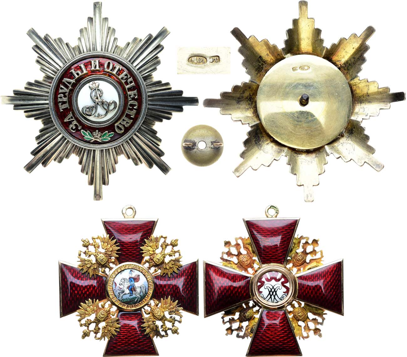 Звезда ордена. Серебро, эмаль; 54,94г. Размеры: 76х76мм. Клейма на реверсе: 1. "П.Ф" в прямоугольном щитке. 2. Санкт-Петербургского окружного пробирного управления после 1908 года ("альфа", женская голова в кокошнике вправо, "84") в овальном щитке. Санкт-Петербург, фирма П. Фокина, после 1908 года. Интересный коллекционный экземпляр. Светло-серая патина. Трещины эмали. Вензель подвижен. Гайка от другого знака (бронза, серебрение). Чрезвычайно редка. AU. Орденские звёзды производства фирмы П. Фокина встречаются особенно редко и представляют высокий коллекционный интерес. Знак ордена. Золото, эмаль, деколь; 36,48 г. Размеры: 57х53 мм. Клейма: 1. Санкт-Петербургского окружного пробирного управления после 1908 года ("альфа", женская голова в кокошнике вправо, "56") в овальном щитке. 2. "ВД" (В.Я. Динаков) в круглом щитке - клеймо ювелира фирмы "ЭДУАРДЪ" - на реверсе верхнего луча. Российская Империя, Санкт-Петербург, 1910-1917 гг. Фирма "Эдуардъ". Превосходный по сохранности коллекционный экземпляр. Чрезвычайно редок. UNC. Комплект сочетает в себе красивую заказную звезду и капитульный орденский знак.