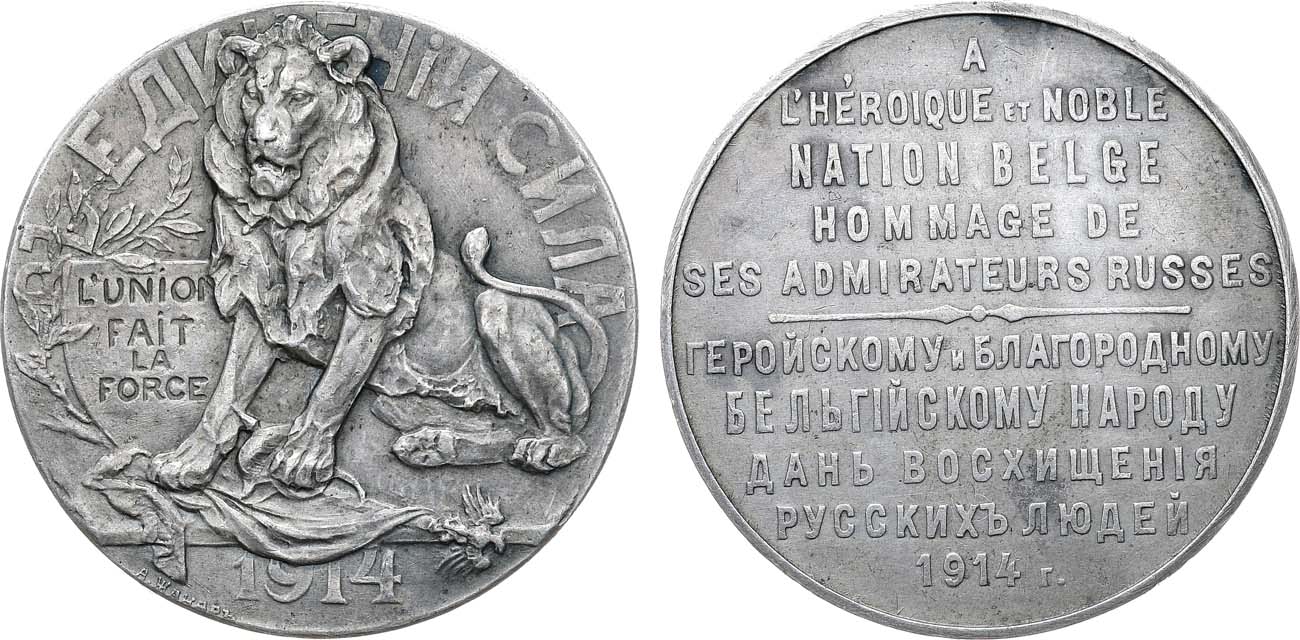 Серебро. 18,42г. Диаметр 32 мм. Из серии медалей Российского Общества нумизматов в память Первой мировой войны 1914–1918 гг. Петроград, 1914 г. Мастерская (ателье) А.Ф. Жакара (аверс — внизу слева у окружности: "А.ЖАКАРЪ"). Медальер Г.И. Малышев (без подписи). Дьяков 1581.1(R1). AU 55.