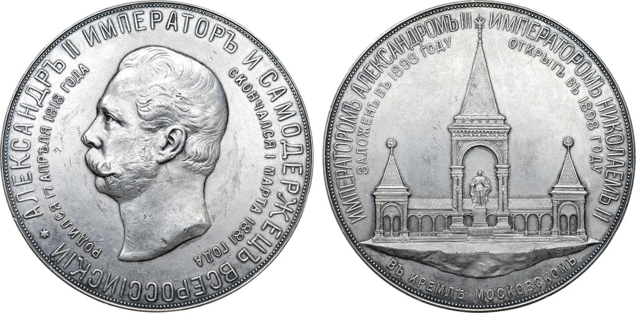 Серебро. 226,89г. Диаметр 78 мм. Санкт-Петербургский монетный двор. Медальер А.А. Грилихес-сын (на аверсе под линией обреза "ГРИЛ. СЫНЪ"; на реверсе в обрезе изображения справа "ГРИЛИХ. СЫНЪ Р."). Смирнов 1148/а. Дьяков 1261.1(R3). AU.