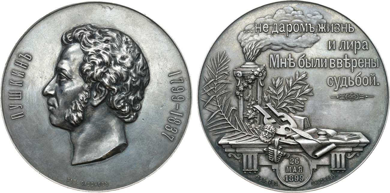 Серебро. 156,62г. Диаметр 67,3 мм. Санкт-Петербургский монетный двор. Медальер М.А. Скуднов (аверс — внизу на поле: "РѢЗ. СКУДНОВЪ."; реверс — внизу на поле: "ЛѢП. РѢЗ. — СКУДНОВЪ."); аверс — по эскизу С.З. Важенина, реверс — по эскизу М.Я. Виллие. Смирнов 1159. Дьяков 1289.1(R4). AU/UNC.