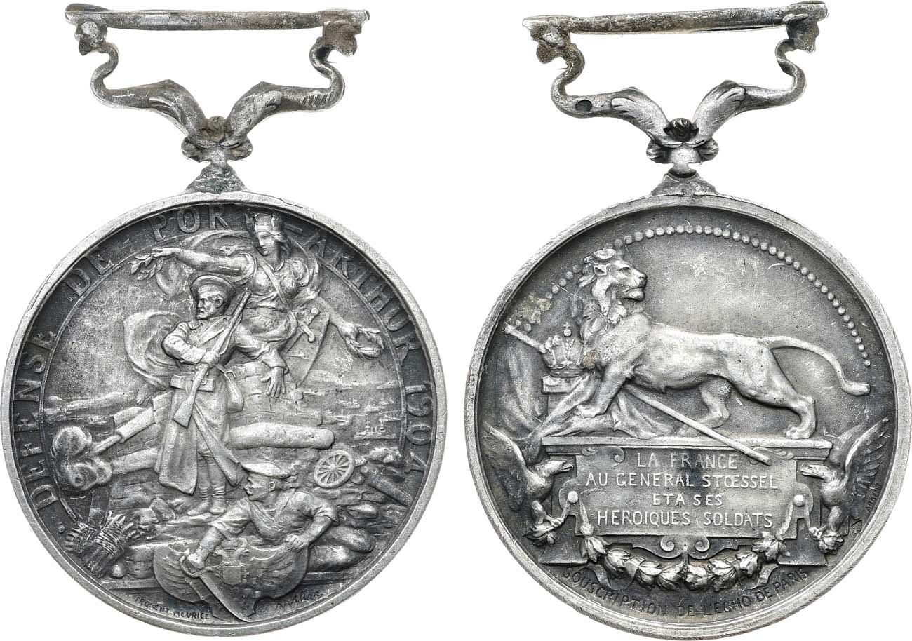 Серебро. 13,59г. Диаметр 32,1 мм. Мастерская Ш.Ф. Фроман-Мориса, Франция, Париж, 1904-1905 гг. Медальер А.Ж. Аллар (на реверсе внизу у окружности "FROMENT MEURICE", правее "A Allar"). Клейма на аверсе медали справа внизу у окружности: название металла «ARGENT» и клеймо фирмы в щитке в форме ромба. Тираж: 5982 экз. Биткин 1253. Дьяков 1395.1(R2). UNC.