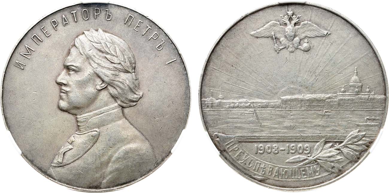 Серебро. Диаметр 41 мм. Санкт-Петербургский монетный двор. Медальер А.А. Грилихес (сын) (аверс — справа внизу у окружности: "А.А.Г."; реверс — на обрезе, слева от лавровых листьев: "ГРИЛИХЕСЪ"). Смирнов, доп. 1403/а. Дьяков 1468.1(R1). AU 55.