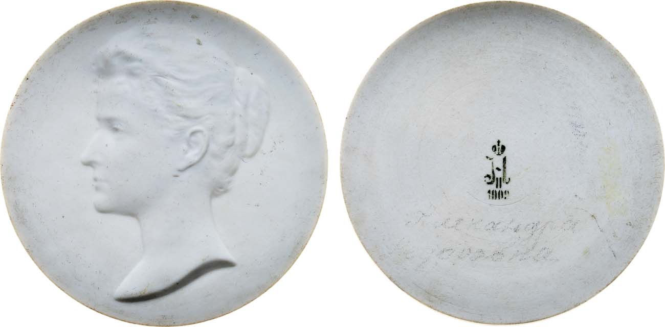 Фарфор. 88,44г. Диаметр 97 мм. Санкт-Петербург, Императорский фарфоровый завод (на реверсе по центру марка по бисквиту "вензель Николая II / 1909"). По модели А.К. Тимуса. UNC.
