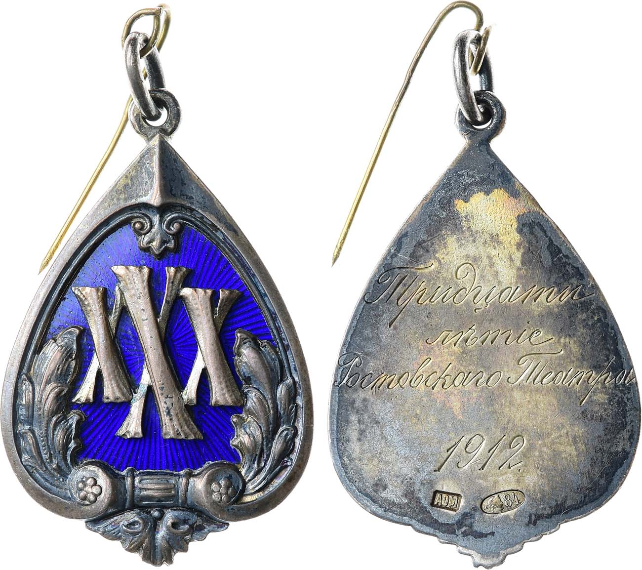 Серебро, золочение, эмаль. 16,23г. Размеры 28х43 мм. Клейма на реверсе: 1. Фирменное "АОМ" в прямоугольном щитке. 2. Санкт-Петербургского окружного пробирного управления после 1908 года ("альфа", женская голова в кокошнике вправо, "84") в овальном щитке. Гравировка на реверсе "Тридцати/ лѣтiе/ Ростовскаго Театра/ 1912." Российская Империя, Санкт-Петербург, 1912 год. UNC.