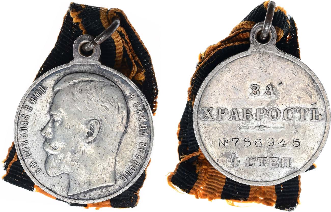 Серебро. Диаметр 28 мм. №756945. Санкт-Петербургский монетный двор. Медальер А. Васютинский (без подписи). 1910-е гг. С фрагментом оригинальной ленты. Биткин 1113. Петерс182/з. Дьяков 1133.10(R2). XF.