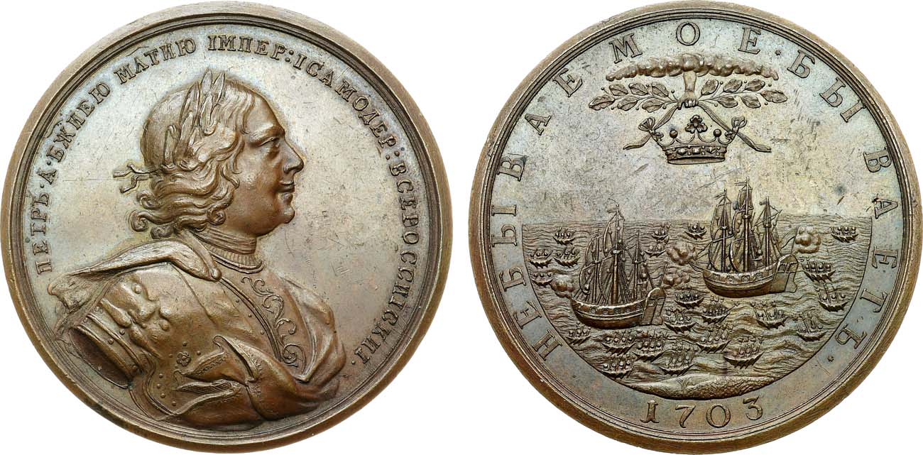 Бронза. 81,3г. Диаметр 56 мм. Санкт-Петербургский монетный двор. Из серии медалей на события Северной войны. Без подписи медальера. Биткин К145(R). Смирнов 167. Дьяков 16.6. MS 61.