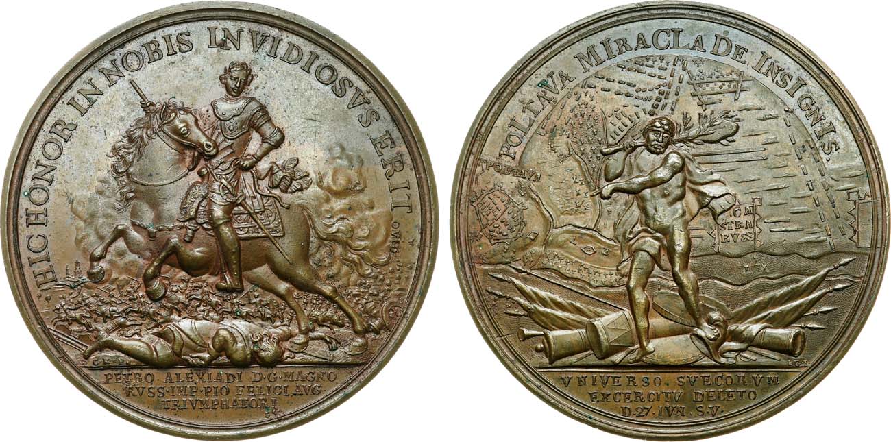 Генеральное сражение Северной войны между русскими войсками под командованием Петра I и шведской армией под командованием Карла XII. В результате Полтавской битвы шведская армия была настолько обескровлена, что уже не могла вести активных наступательных действий. Военное могущество Швеции было подорвано, и в Северной войне произошёл перелом в пользу России. С аукциона "Монеты и Медали" 71, Москва, октябрь 2011 года, лот 24.