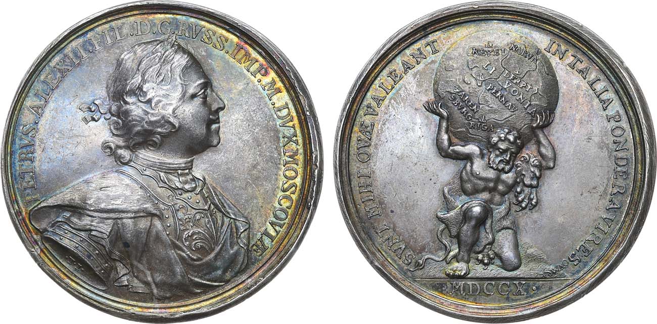Серебро. 42,83г. Диаметр 47,5 мм. Санкт-Петербургский монетный двор. Из серии медалей на события Северной войны. Медальер Т. Иванов (аверс — в обрезе рукава "•Т•I•"). Смирнов 194. Иверсен XXXV-c. Дьяков 38.6(R1). UNC.