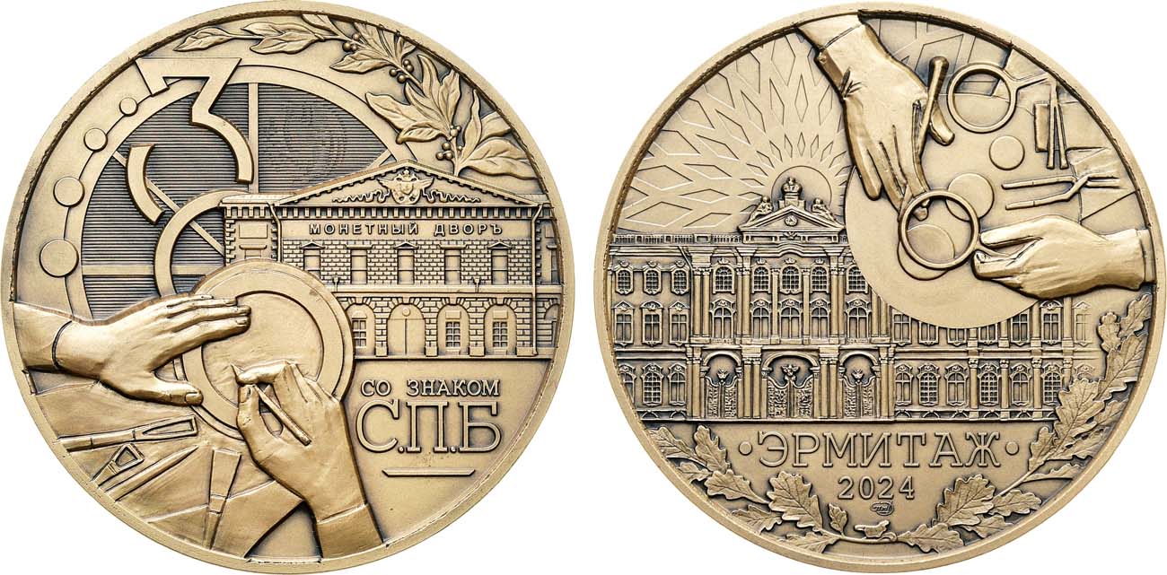 Специально к открытию выставки «Со знаком “С.П.Б.”», посвященной 300-летию Санкт-Петербургского монетного двора, на Санкт-Петербургском монетном дворе отчеканили памятные медали и жетоны с изображением здания Санкт-Петербургского монетного двора и Зимнего дворца. Они выполнены по эскизу художницы Пермской печатной фабрики – филиала АО «Гознак» Алины Хохряковой, доработанному художником дизайнерского центра АО «Гознак» Андреем Брынзой.